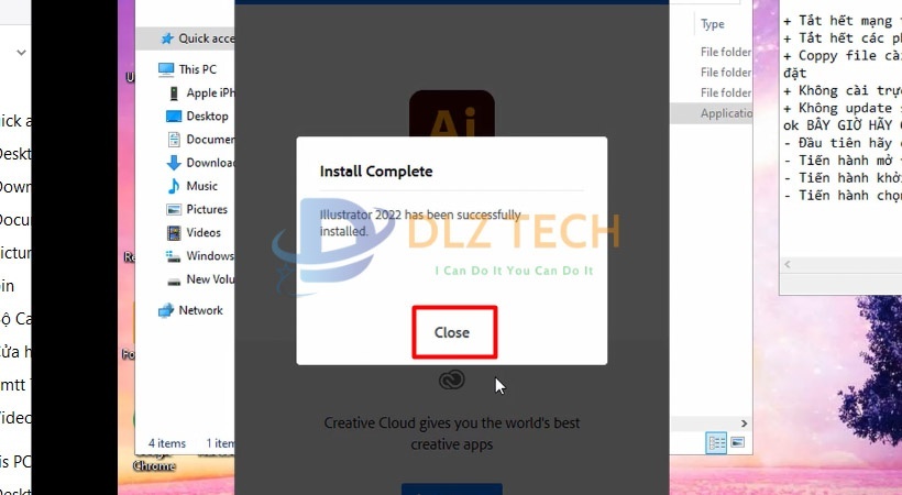 Bước 4 : Chọn Close hoàn tất cài đặt Illustrator 2022